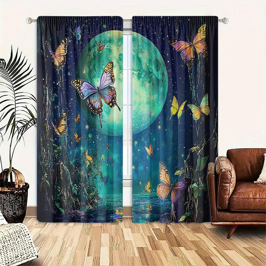 2pcs Moonlight Butterfly Print Curtains - Light Filtering Design Durable Polyester Fabric Machine Washable Classic Style for