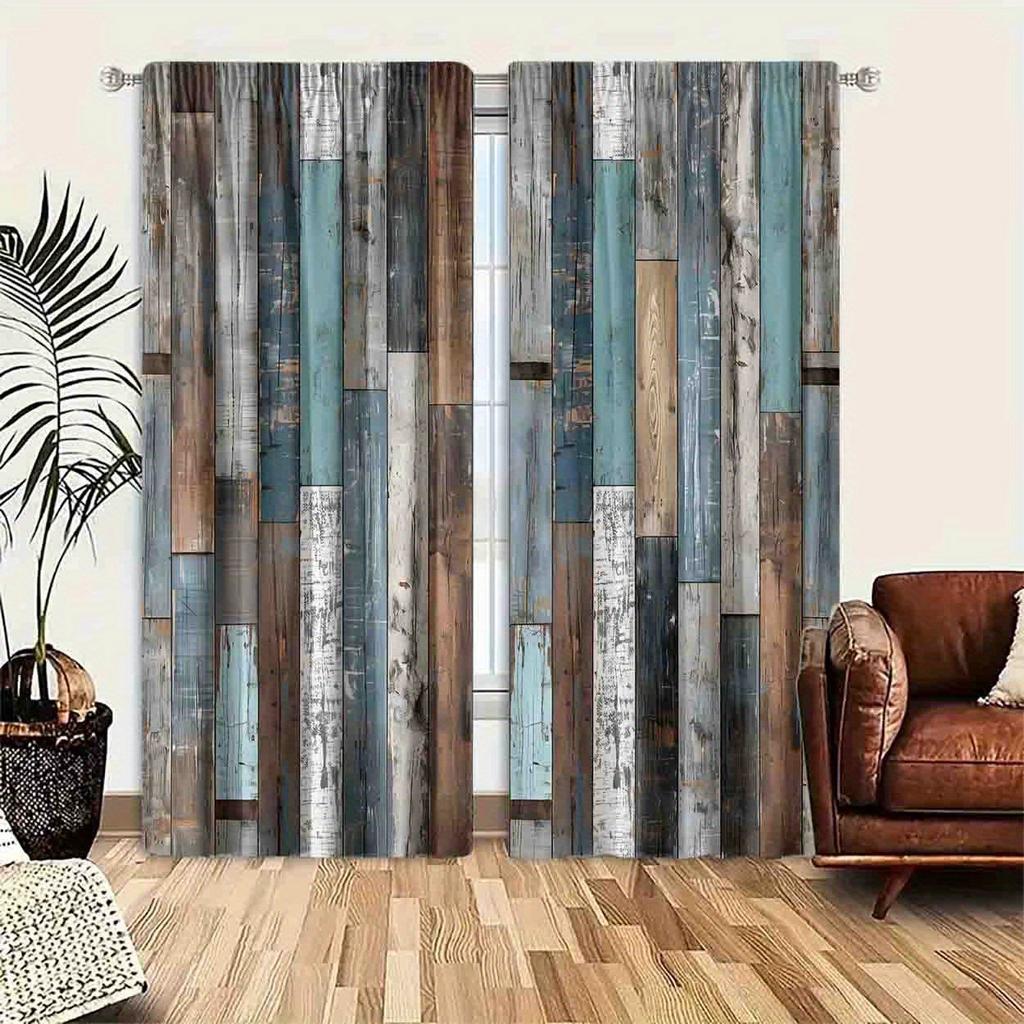 2 Sets of Vintage Artificial Wood Printed Filter Curtains-polyester Pole Bag Hanging Home Decoration Multiple Sizes Available