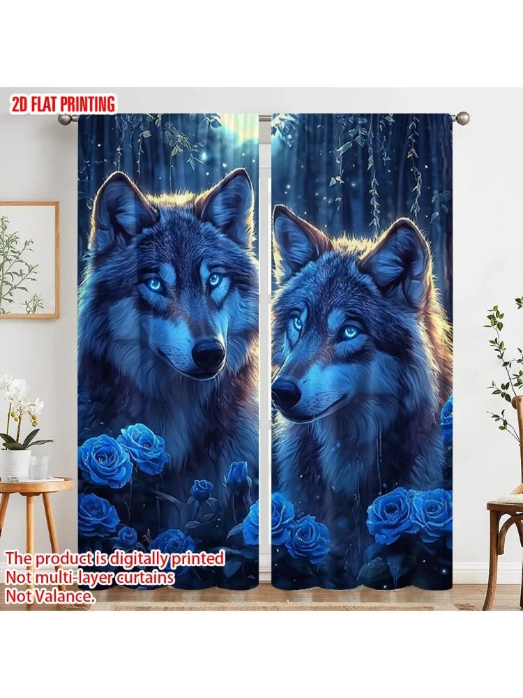 2pc 2D Plane Printing Curtains&Window Treatment Mystical Wolf & Blue Roses Polyester Easy Install (without Rod) Festive Perfect