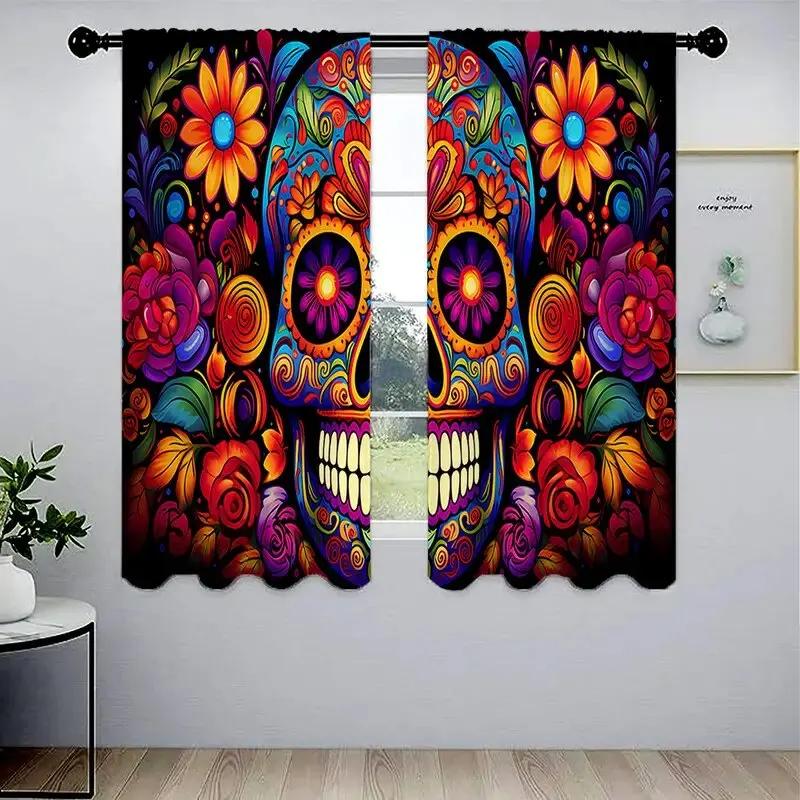 Halloween Skull and Flower Pattern Printed Curtains Window Decorations Home Decorations Room Decorations