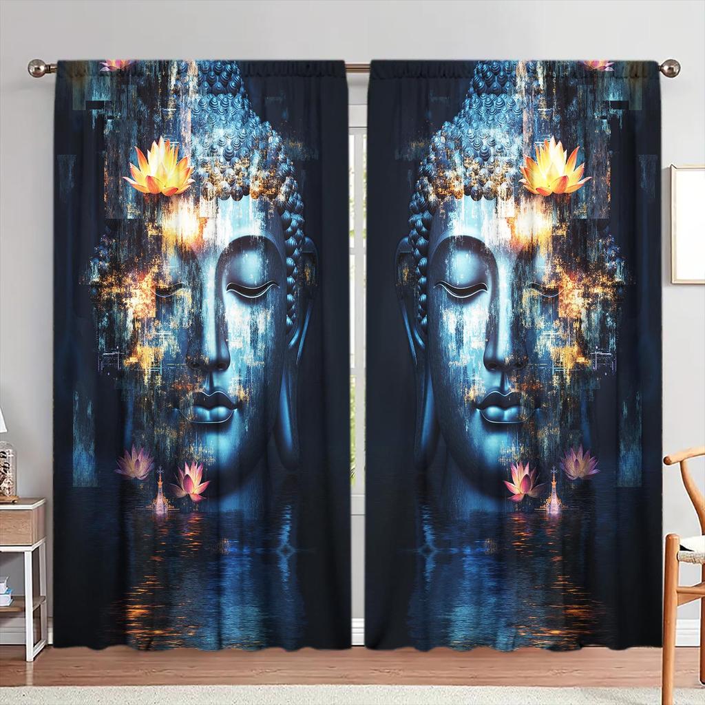 2-Panels Shakyamuni Buddha Lotus Flower Decorative Curtains Semi Transparent Without Lining Durable Polyester Fiber Curtains
