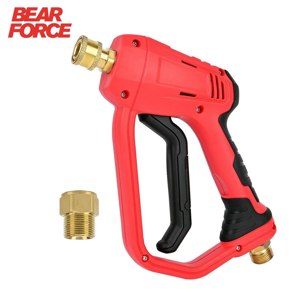 Bear Force short pressure washer gun comes with M22-ID14mm inlet and 1/4” quick connector coupler. The stubby pressure washer gun is compatible with Sun Joe, Ryobi, Greenworks, CRAFTSMAN, Champion, Powerstroke, and other pressure washers up to 4000 psi.
