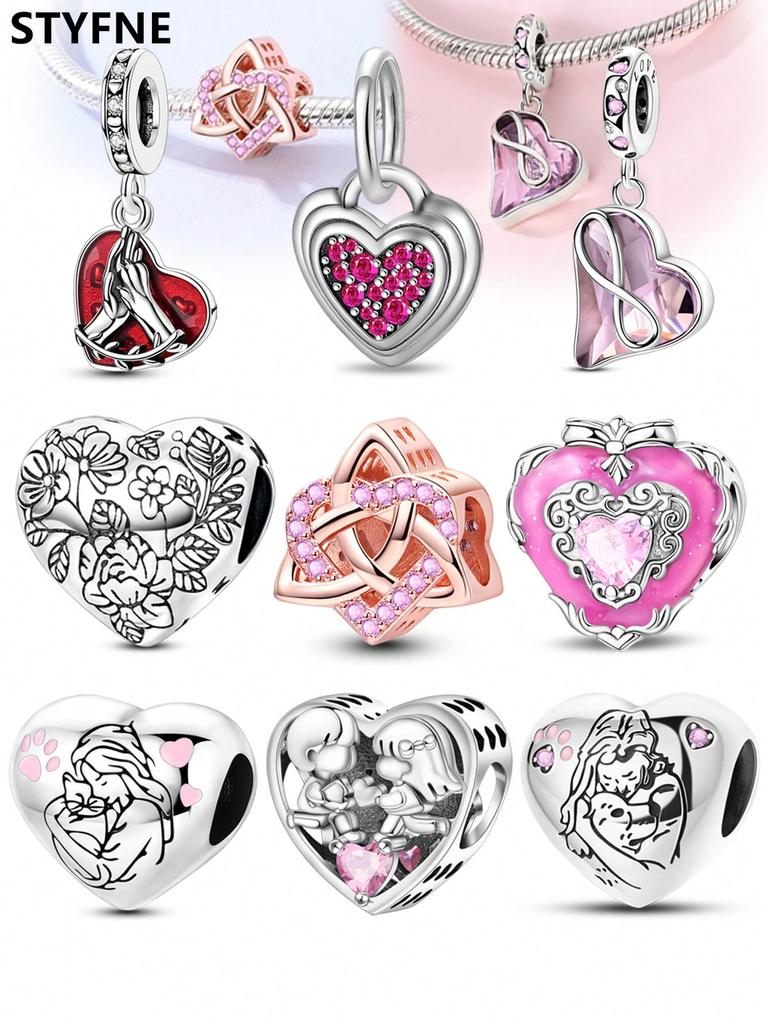 Copper Plated Original Charms Valentine'S Day Pink Heart Beads Fit Bracelet Women'S Jewelry Gift