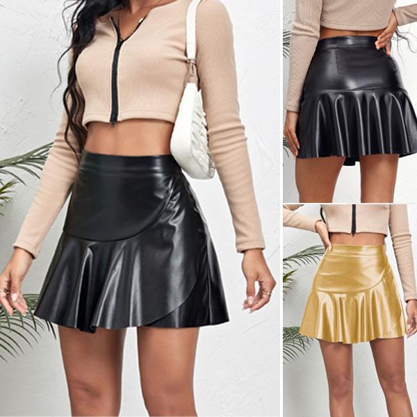 Women High Waist Bodycon PU Leather Skirts Office Ladies Bandage Ruffles Mini Skirt