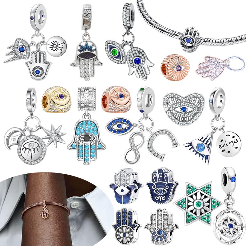 Sparkling Hamsa, All-Seeing Eye & Feather Three-Sided Charm Beads Fit Original Bracelets Accessories Diy Jewelry Gifts