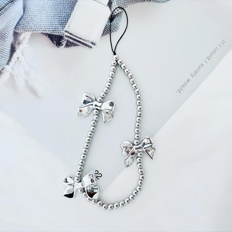 Ins Y2K Silver Love Heart Bowknot Phone Charm Strap Bead Pendant For Phone Accessories Hanging Rope Girl Jewelry