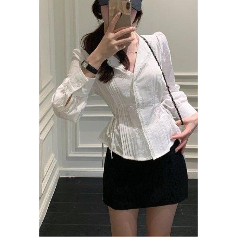 High-end Heavy-duty Pleated White Long-sleeved Shirt for Women In Autumn Waist Slimming Niche Versatile Tops