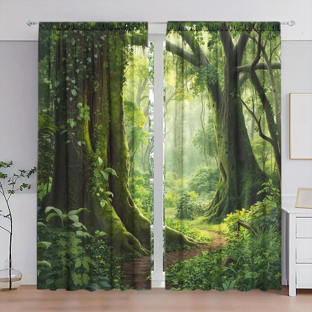2-Panels Green Primitive Forest Nature Printed Curtains Shade and Privacy Protection Suitable for Decorating Various Rooms