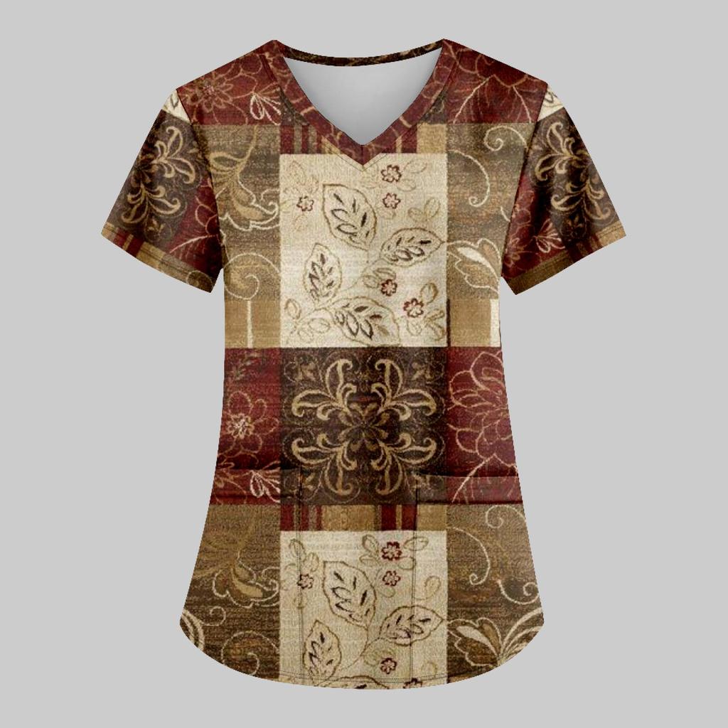 Women's Fashion Printed Work Uniform With Pocket T-Shirt Short Sleeve Top