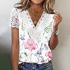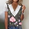 Women's Lace T-shirt Casual Printing Short-sleeved V-neck Lace Sleeve Patchwork T-shirt