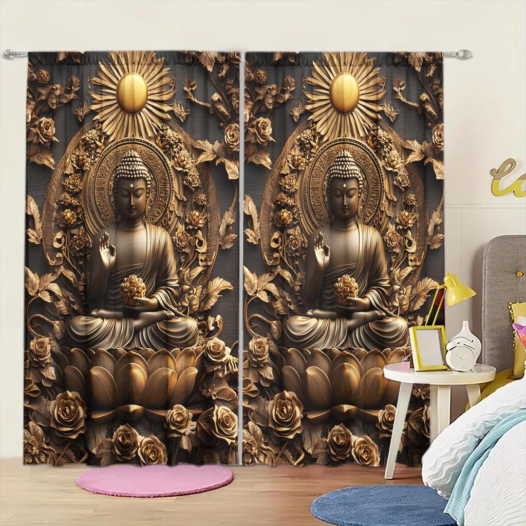2 Panels Buddha Wood Carving Pattern Window Curtains - Heat-insulating Suitable for Decorating Curtains In Various Rooms