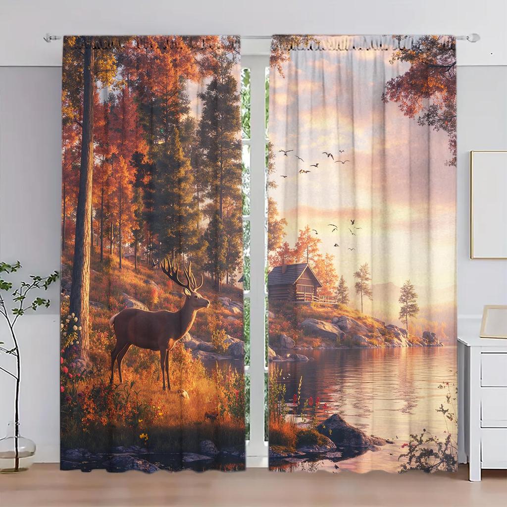 2 Panels Autumn Forest Deer Pattern Window Curtains Half Blackout Suitable for Artistic Home Decorative Curtains