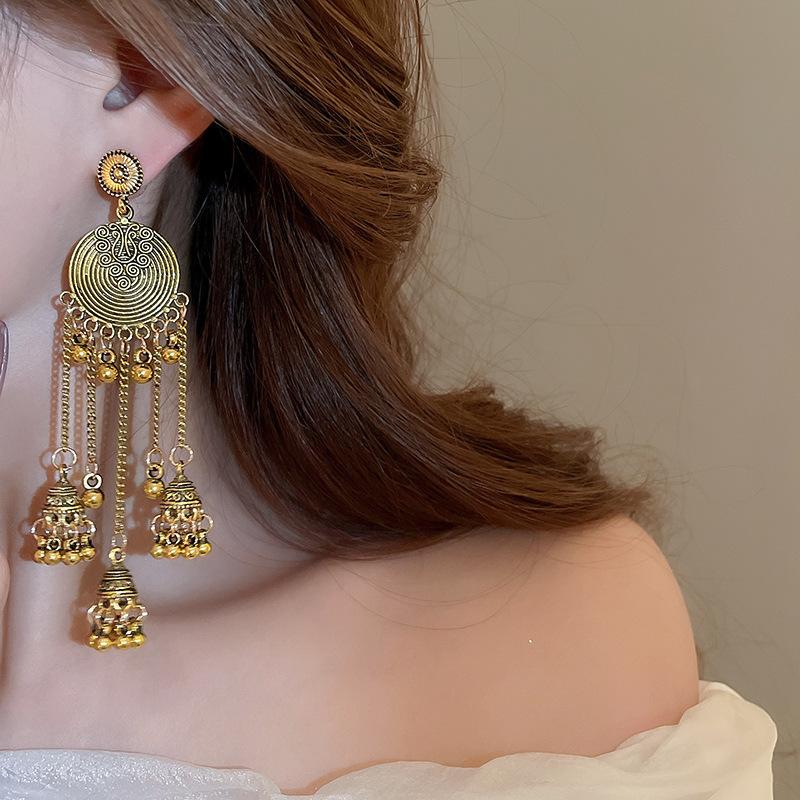 Ethnic Style Round Wind Chime Tassel Earrings High-end Metallic Temperament Earrings for Women