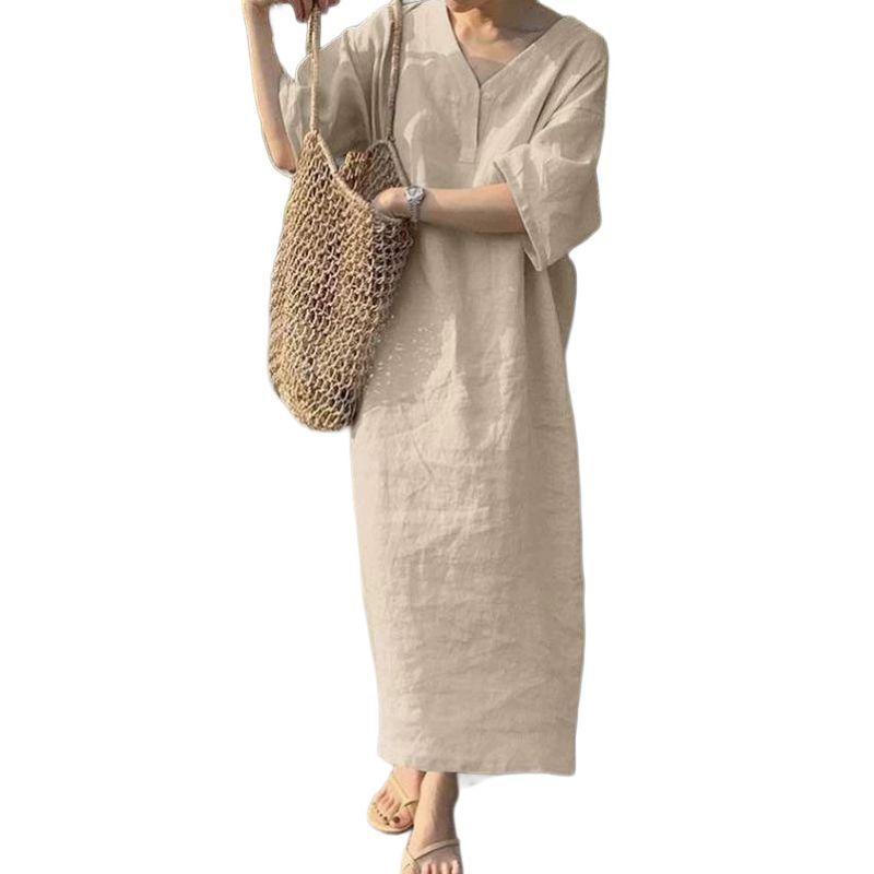 Women's Loose-Fit Short-Sleeve V-Neck Solid-Color Simple Style Cotton-Linen Blend Dress