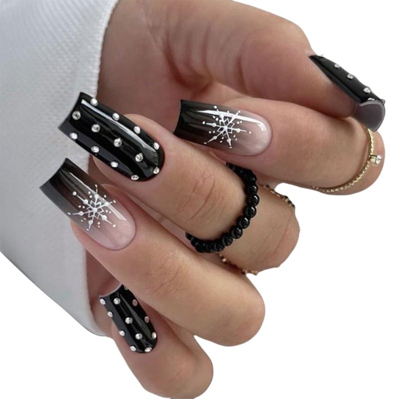 24 Pcs Gradient French Artificial Nail Christmas False Nail Winter Snowflake Stick On Nail Rhinestones Press On Nail