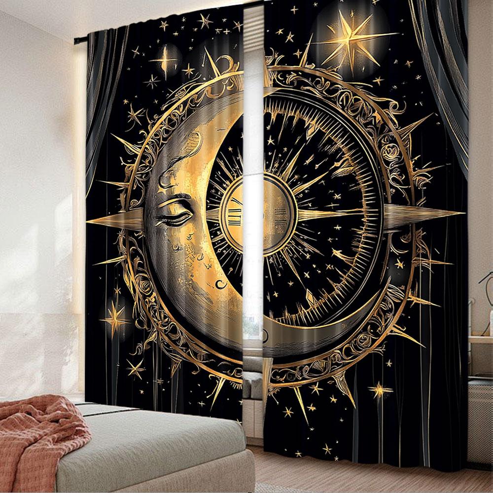 2Pcs Sun Moon Windows Curtains Retro Bohemian Antique Hippie Gold Sun Crescent And Star Curtains For Living Room Bedroom A