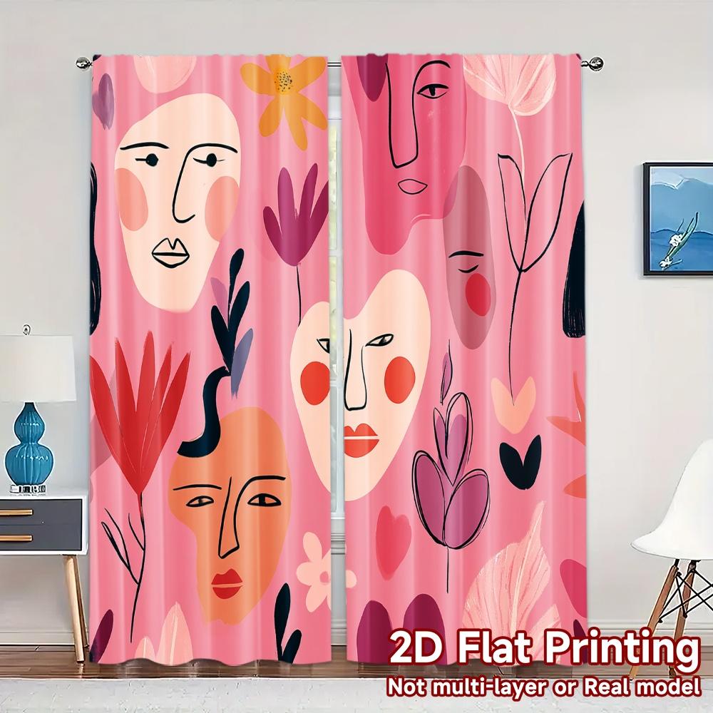 2D Flat Printing JIT 2pcs Curtains (Without Rod) Abstract Faces Deco Chic Print Curtains Versatile Polyester Fabric Curtains