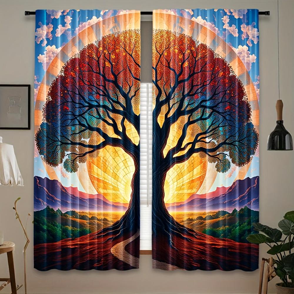 2pcs Colorful Tree Print Curtains Polyester Rod Pocket Design Light Filtering for Bedroom Living Room Office Machine Washable