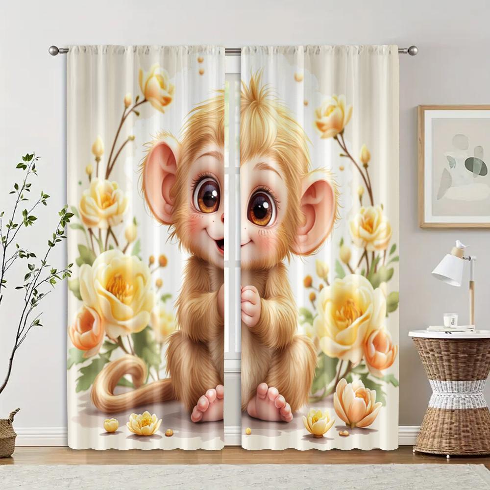 2 Pcs Filtering Curtains (excluding Rods Non-movable Without Batteries) Cute Monkey for Use In Bedrooms and Living Rooms
