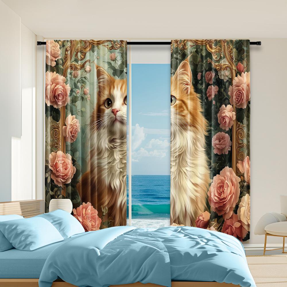 2 Pcs Versatile Polyester Transparent Curtains for Home Decoration Rose Cat for Use In Bedrooms and Living Rooms