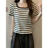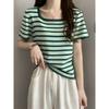 Square Collar Short Color Matching Striped Short-sleeved T-shirt Womens Summer Updated Simple Striped Top