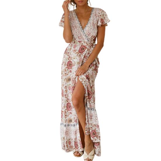 With the floral print, V-neck and open hem design, this dress is attractive and sexy.