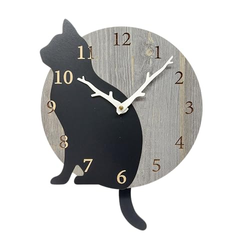 Black Cat Wall Clock with Pendulum, Natural Wood Design, Stylish Cat Lover's Gift, Cat Motif, Nordic Style Interior, Cute Accessory with Wagging Tail