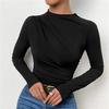 Ladies Spring Autumn Long Sleeve O Neck Solid Color Pleated Bodycon Pullover Casual T Shirt Top