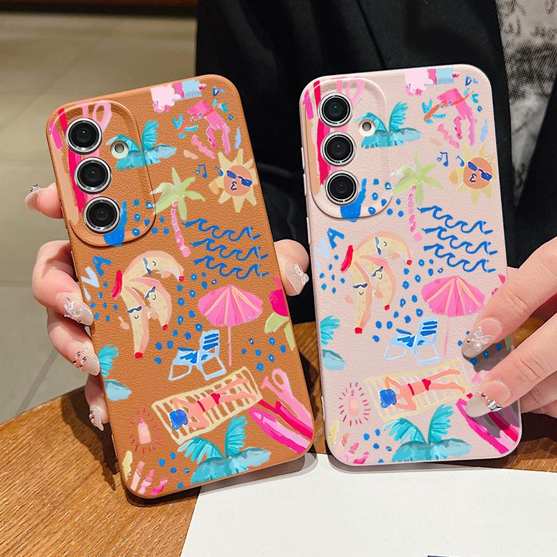 Cartoon Vacation Painting Case For Samsung Galaxy S26 Ultra S25 Edge S24 S23 S22 Plus S21 FE Leather Texture Silicone Cover