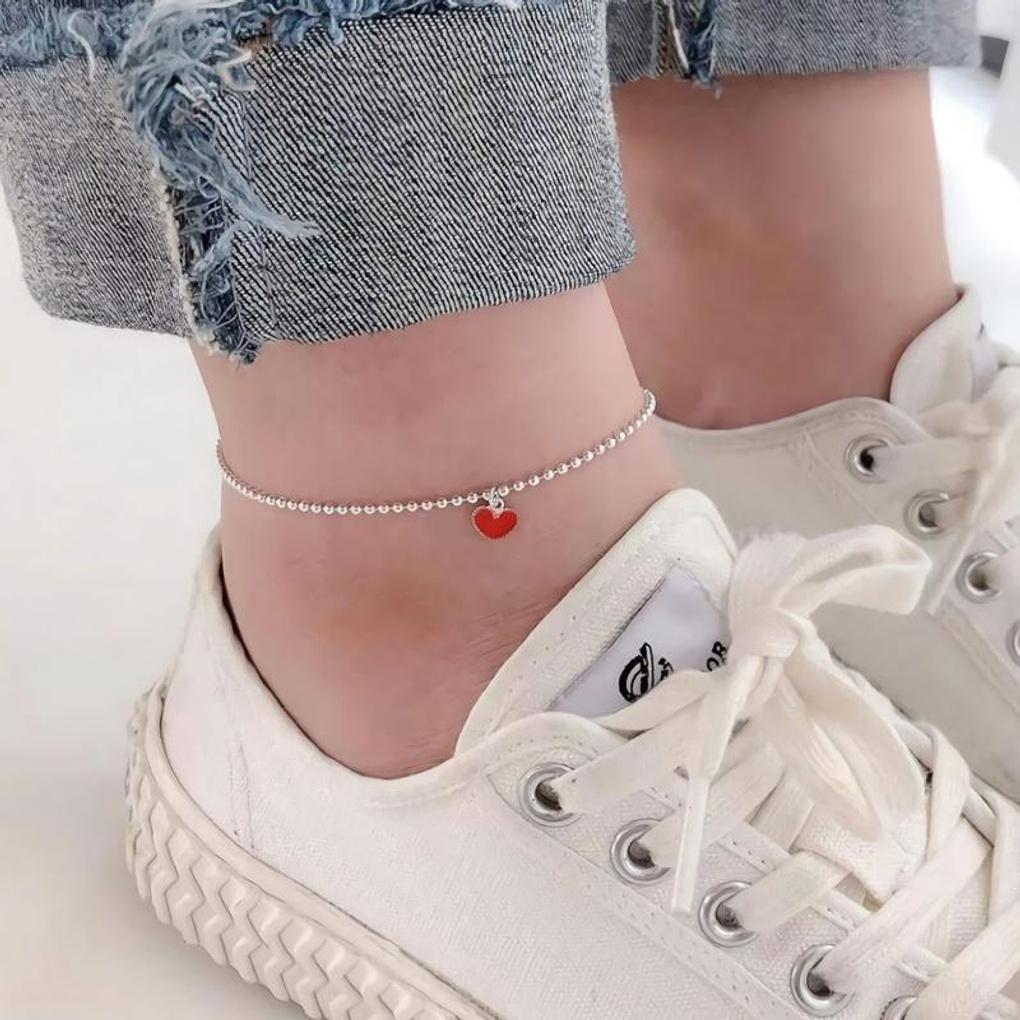 Women's Silver 925 Red Heart Simple Ball Anklet