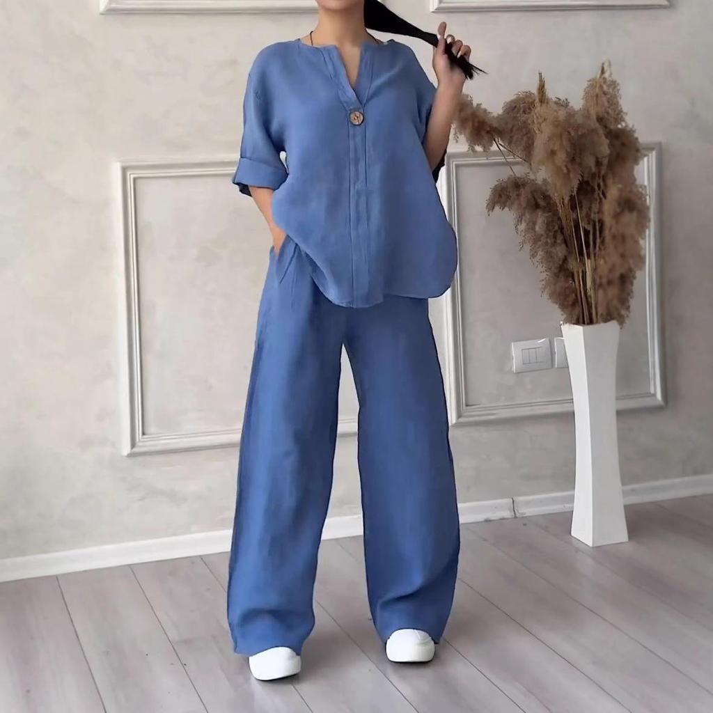 This casual set is designed for women seeking comfort and style. Crafted from a blend of cotton and linen, it offers breathability and softness for all-day wear. The solid color pattern provides a timeless look, perfect for various occasions. The sportive style ensures a relaxed fit that's ideal for everyday activities.