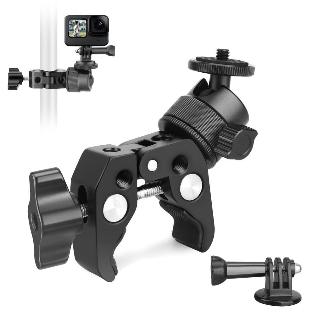 Product Name: Super Clamp 360° Ball Head Camera Mount with 1/4" Screw for GoPro, Anti-Loosening Crab Clamp, Monitor Support/LCD Monitor/Action Camera/DSLR/Bicycle/Motorcycle/GoPro. ulanzi Neewer ST83 Utebit Motorcycle Camera Mount Rod Clamp. High-Quality Materials: Made of sturdy aluminum alloy and precision CNC-machined anodized aluminum for durability and versatility. It accompanies your bike or motorcycle and securely holds it in place. Optimal Load Capacity: The clamp opening width ranges from 0.4" (10mm) to 2.16" (55mm), allowing it to be clamped anywhere, including tables, bars, tripods, camera holders, bicycles, and motorcycles. 360° Ball Head: The camera mount rotates 360° vertically and 360° horizontally, allowing for portrait and landscape orientations. Quickly locks with a knob. The rubber texture not only protects your equipment but also helps you hold it in a better position. Wide compatibility: Universal fit for cameras, monitors, video lights, camcorders, microphones, etc.