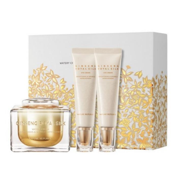The Nature Republic Ginseng Royal Silk Watery Cream & Eye Cream Set is a luxurious anti-aging skincare collection designed to deliver intensive hydration, nourishment, and elasticity care. Formulated with red ginseng extract, royal jelly, silk amino acids, and gold, this premium set helps improve skin texture and radiance while caring for delicate eye areas. Ideal for daily skincare routines targeting dryness, dullness, and early signs of aging.