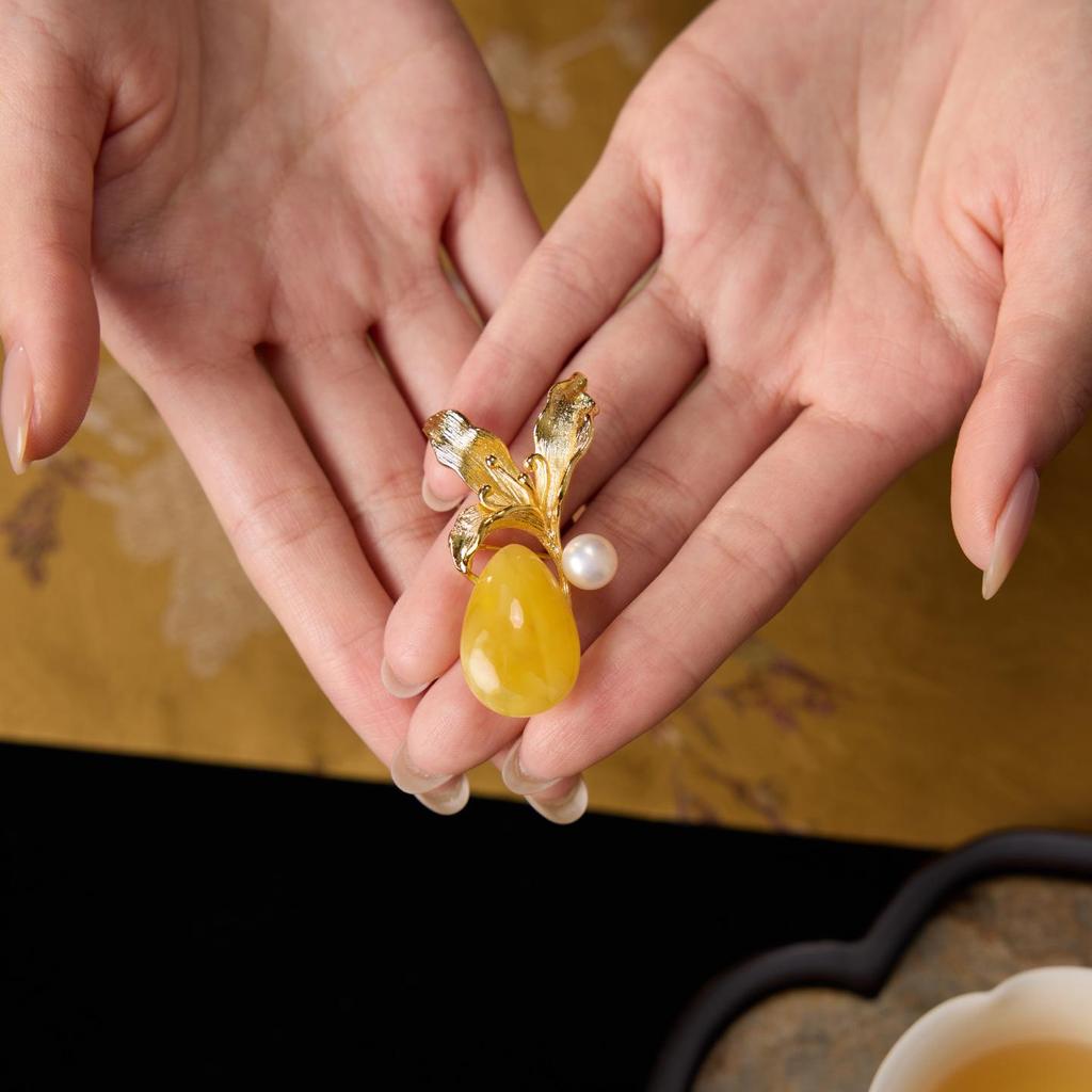 Lily Chinese Enamel Amber Brooch - Elegant Women's Qipao Suit Accessory Gift