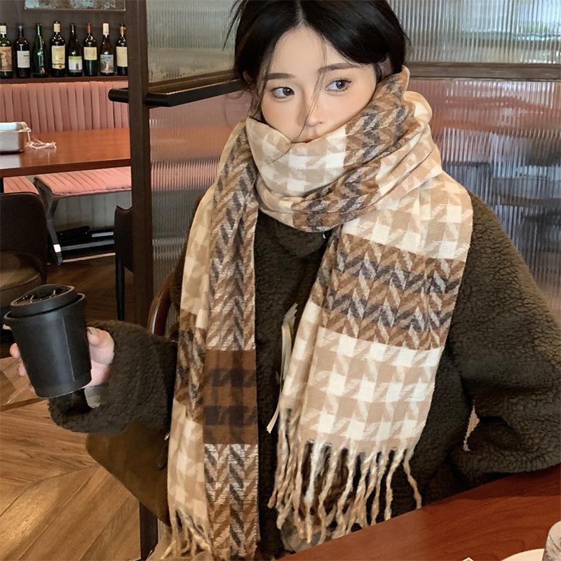 Knitted Retro Scarf Headscarf Winter Women Men Houndstooth Tassel Warm Scarve Pashmina Mujer Femme Male Thick Wrap Shawl Unisex