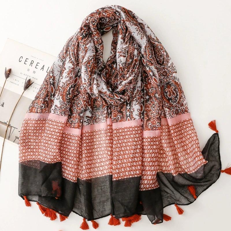 Bohemian Ethnic Style Cotton Linen Texture Scarf Floral Pattern For Travelling Sun Protection Beach Vacation Shawl And Wraps