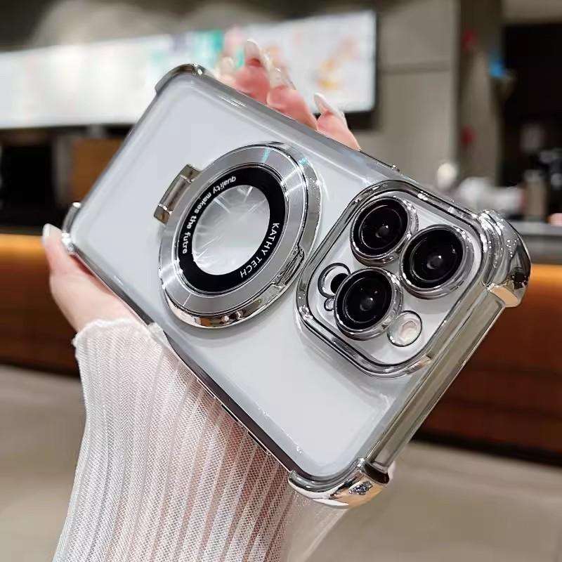 Luxury Plating Shockproof Magnetic Bracket Clear Case for Magsafe for iPhone 16 15 14 13 12 11 Pro Max With Holder Stand Cover