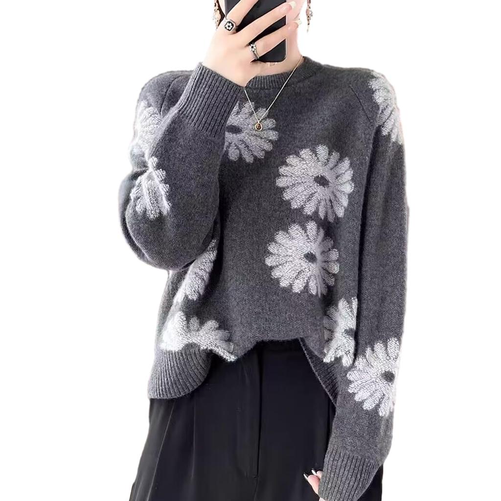 This long-sleeved knit gives off a cute, sophisticated vibe. The floral design makes it a stylish and fashionable addition to any outfit. The slightly loose silhouette creates a slimming effect. The stretchy fabric doesn't feel too tight, making it perfect for casual wear or commuting. Its moderate thickness makes it perfect for fall and winter.