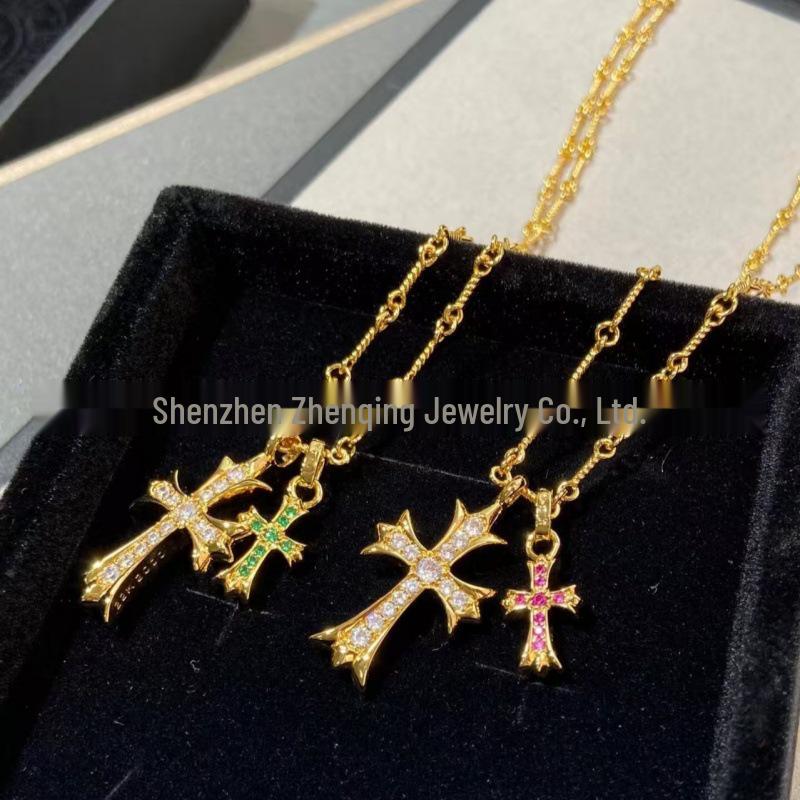 V Gold High Edition Double Cross Necklace with 18K Gold Plating & Multi-Color Diamond Pendant