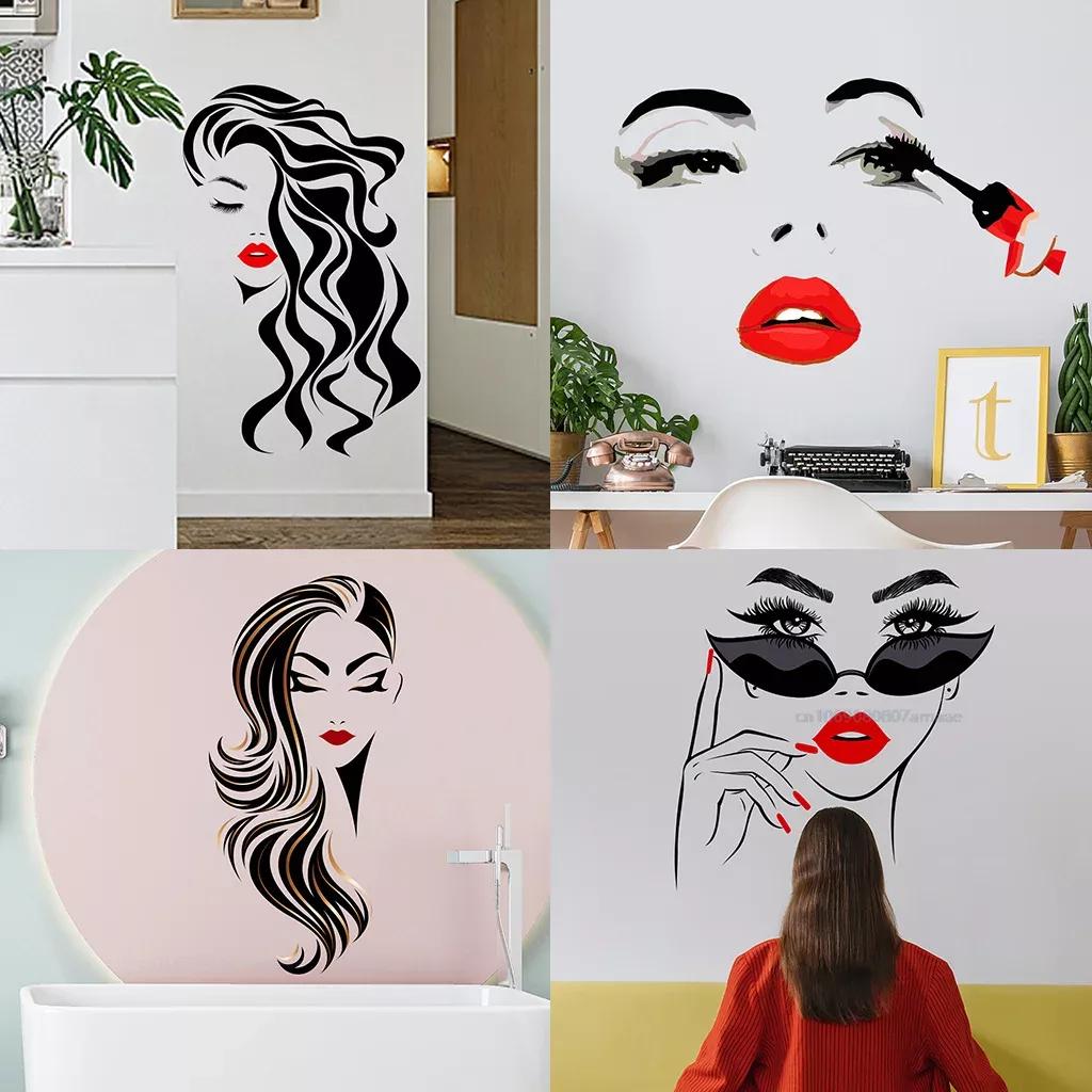 Beauty Female Face Wall Sticker Decal Beauty Studio Wallpaper Cosmetic Makeup Wall Art Sticker Mural Removable Salon Decoration