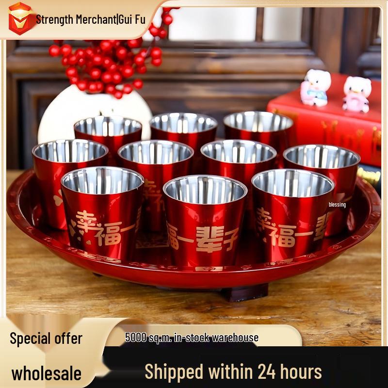Wedding Double-Layer Stainless Steel Teacup - Red Toasting & Ceremony Joy Cup
