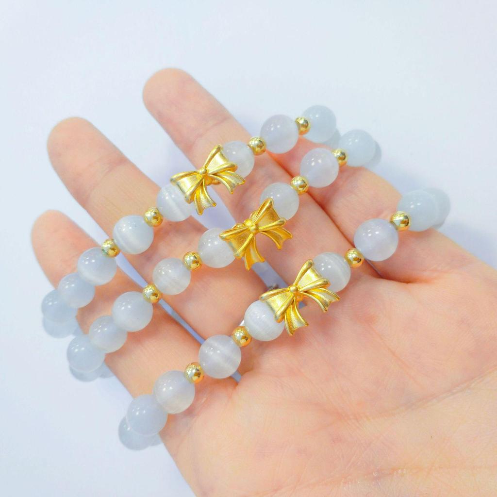 Vietnamese Gilt Brass Bow Bracelet with Cat's Eye Stone & Sand Gold Beads - Women's Elegant Jewelry