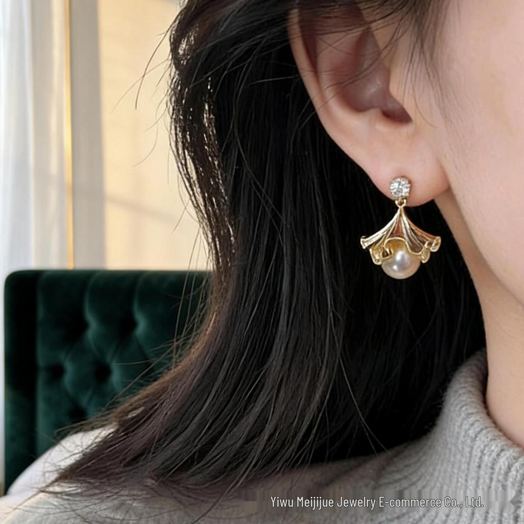 Fan-Shaped Ginkgo Leaf Pearl Tassel Earrings for Women - Light, Luxurious, High-End Statement Pieces