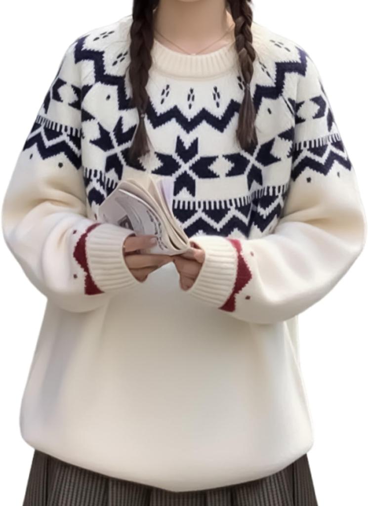 [1. A design that brings a soft winter feeling] This knit sweater features a cute snow pattern that spreads from the chest, allowing you to enjoy the seasonal atmosphere just by wearing it. The gentle Nordic-inspired pattern gives your winter outfit a cozy and warm impression. The relaxed silhouette is perfect for relaxing days. This "cute and grown-up" piece is perfect for everyday wear, as well as for outings and cafe time.