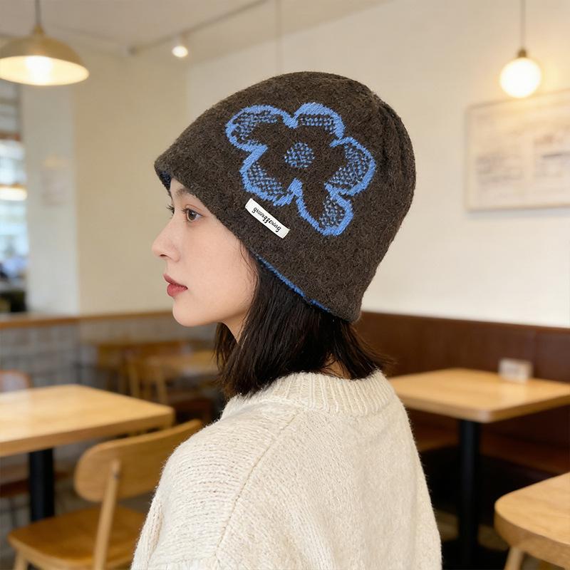 Spring and Autumn Warm Ear Protection Flower Big Head Circumference Knitted Wool Pile Hat Woman