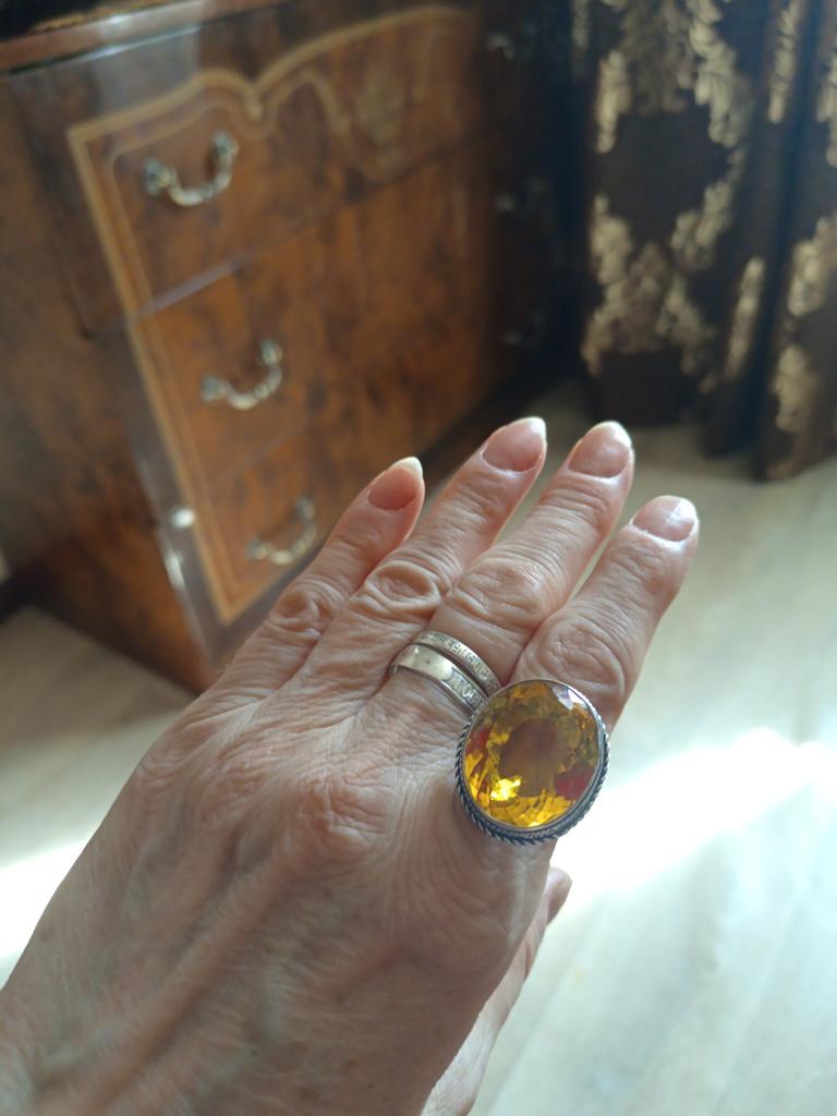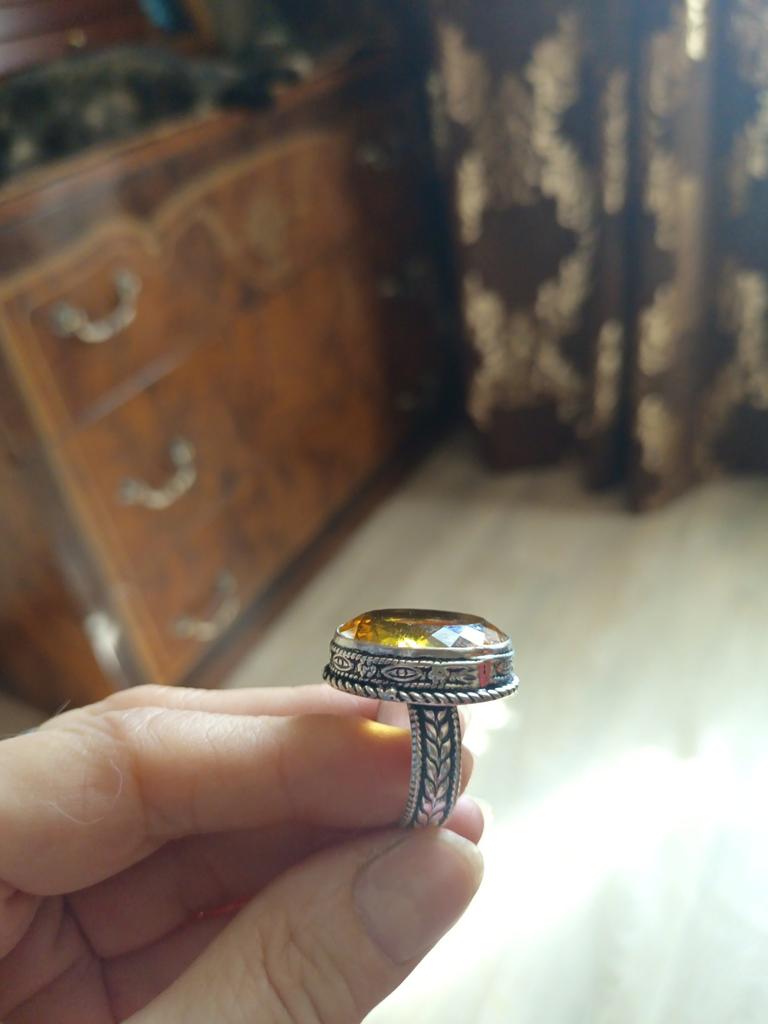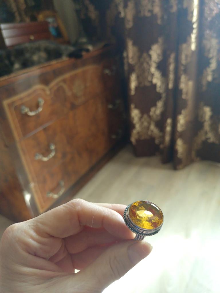 A gorgeous silver ring, quite large, with a beautiful bright yellow natural citrine, just like in the advertisement photo. The ring size corresponds to the stated one. The silver hallmark is present. High-quality craftsmanship. Ring size - 2.6 cm × 2.3 cm. Citrine size - 2.4 cm × 1.9 cm. The stone is faceted, without chips or cracks. A lovely purchase.