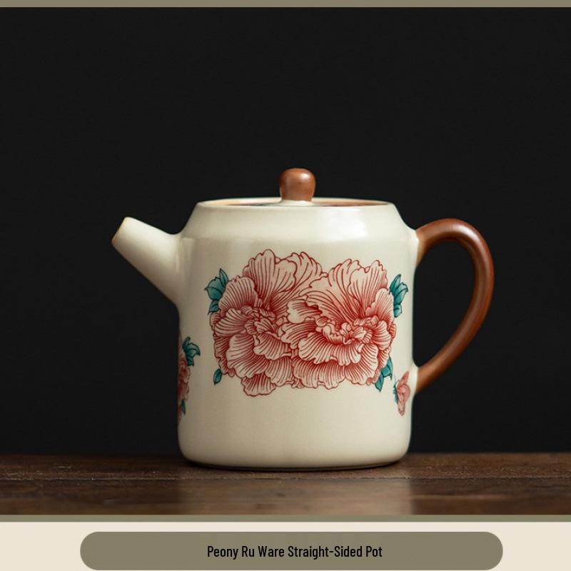Retro Peony Flower Ceramic Teapot: Anti-Scald Design, Straight Body, Kung Fu Tea Set