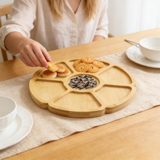 This elegant 9-inch platter features seven separate petal-shaped sections, ideal for serving snacks, fruit, dips, nuts, or charcuterie with style and organization. Handcrafted from 100% natural bamboo, it offers durability and eco-friendliness while enhancing any table setting with its smooth surface and rich texture.