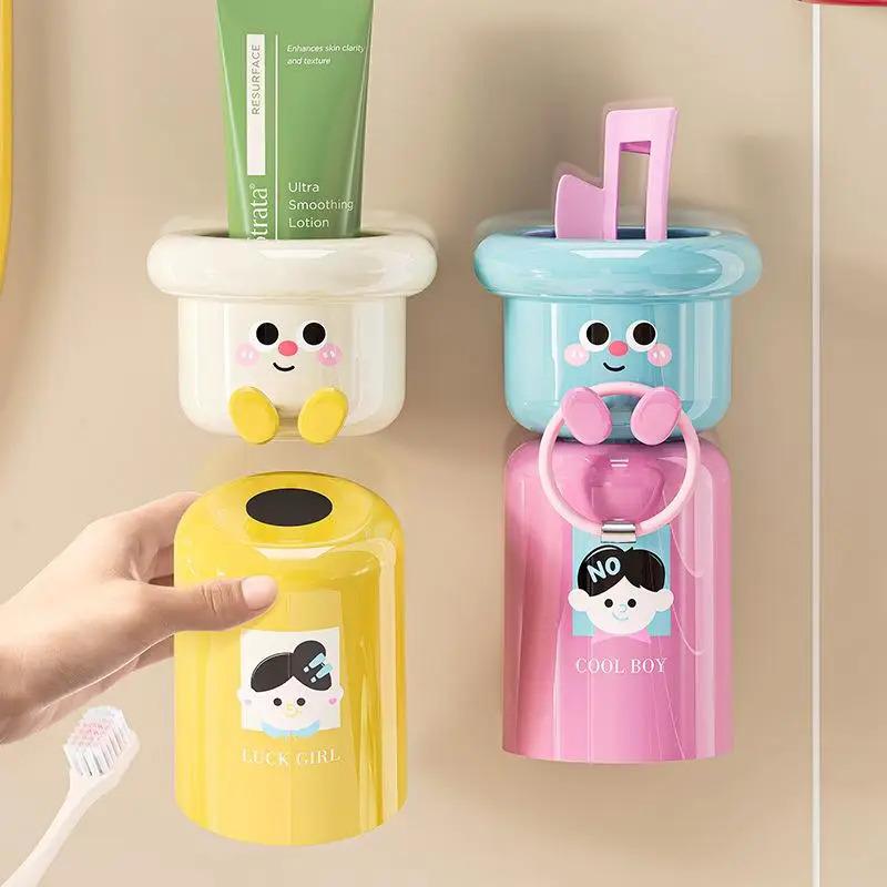 Cartoon Magnetic Toothbrush Holder Punch-Free Upside Down Wall Mounted Bathroom Storage Rack Gargle Cup Organizer