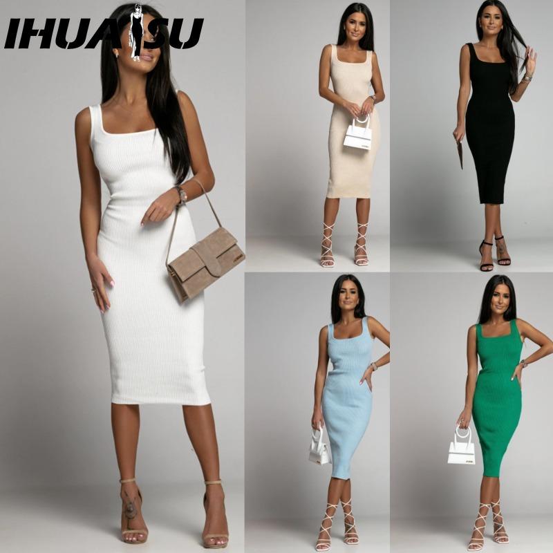 IHUASU Women's Fashion Summer Spring Solid Color Print Sleeveless Casual Dresses